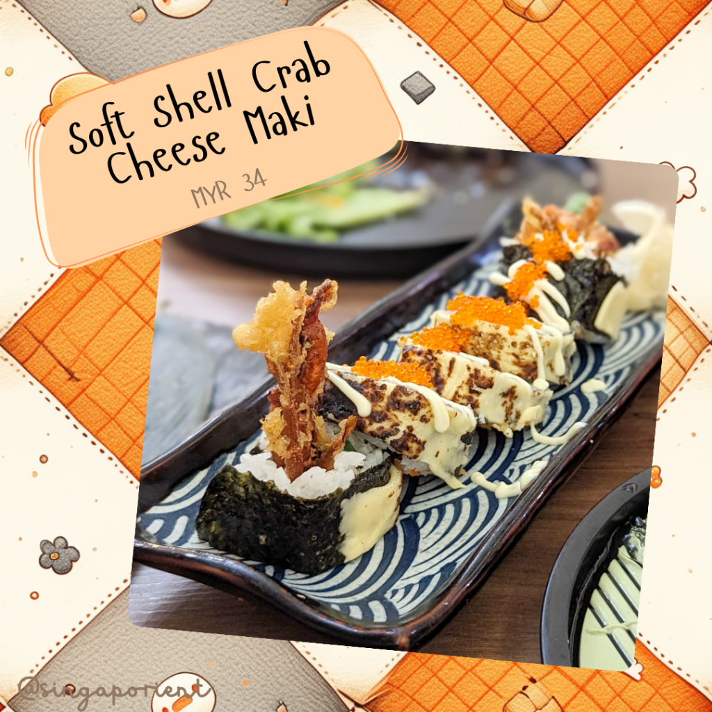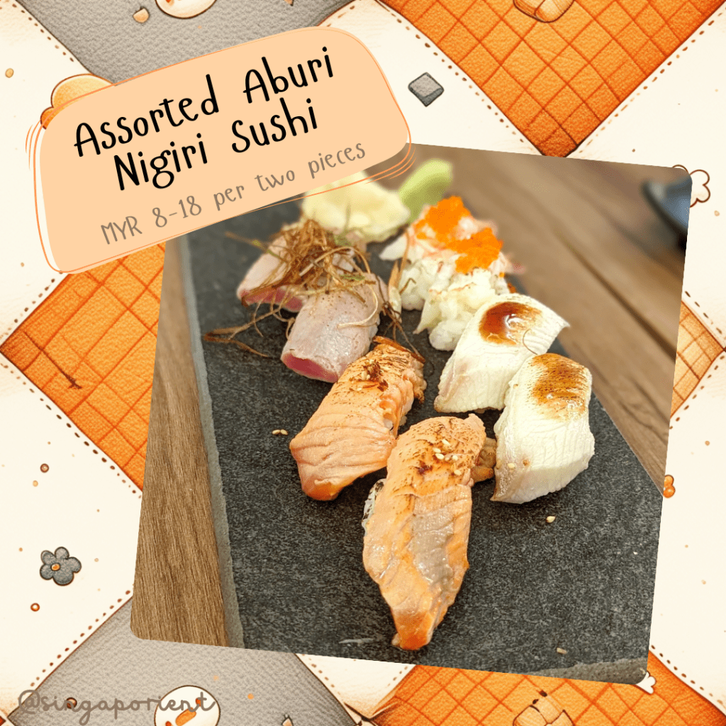 We ordered four sets of aburi nigiri sushi of 2 pieces each – maguro (MYR 8), salmon (MYR 8), amaebi (MYR 18), hamachi (MYR 16). The fish were all a little on the dry side, they might have over-torched it, but the amaebi was nicely done.