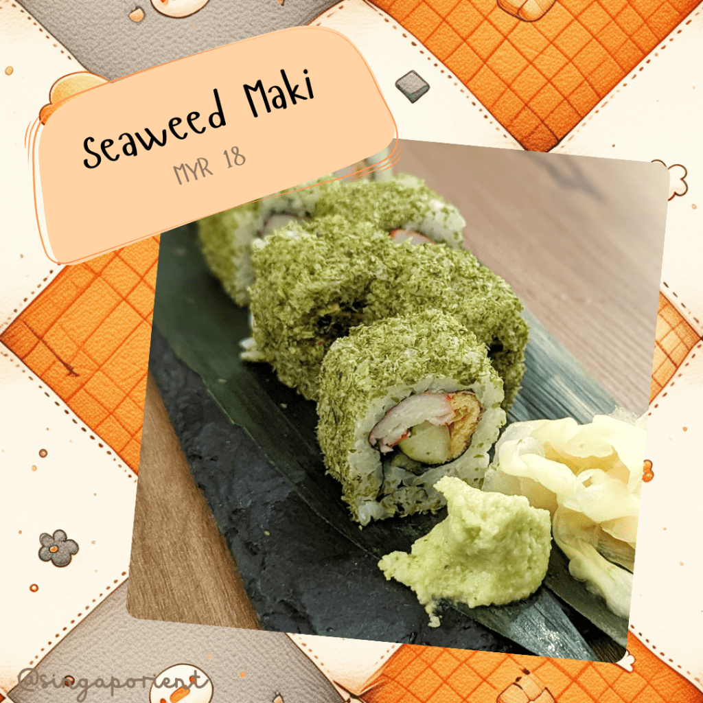 Ms Milo ordered this – I think she was attracted by the “seaweed” in the name but it wasn’t quite what she expected. It was quite ordinary, basically a California roll coated in seaweed powder.